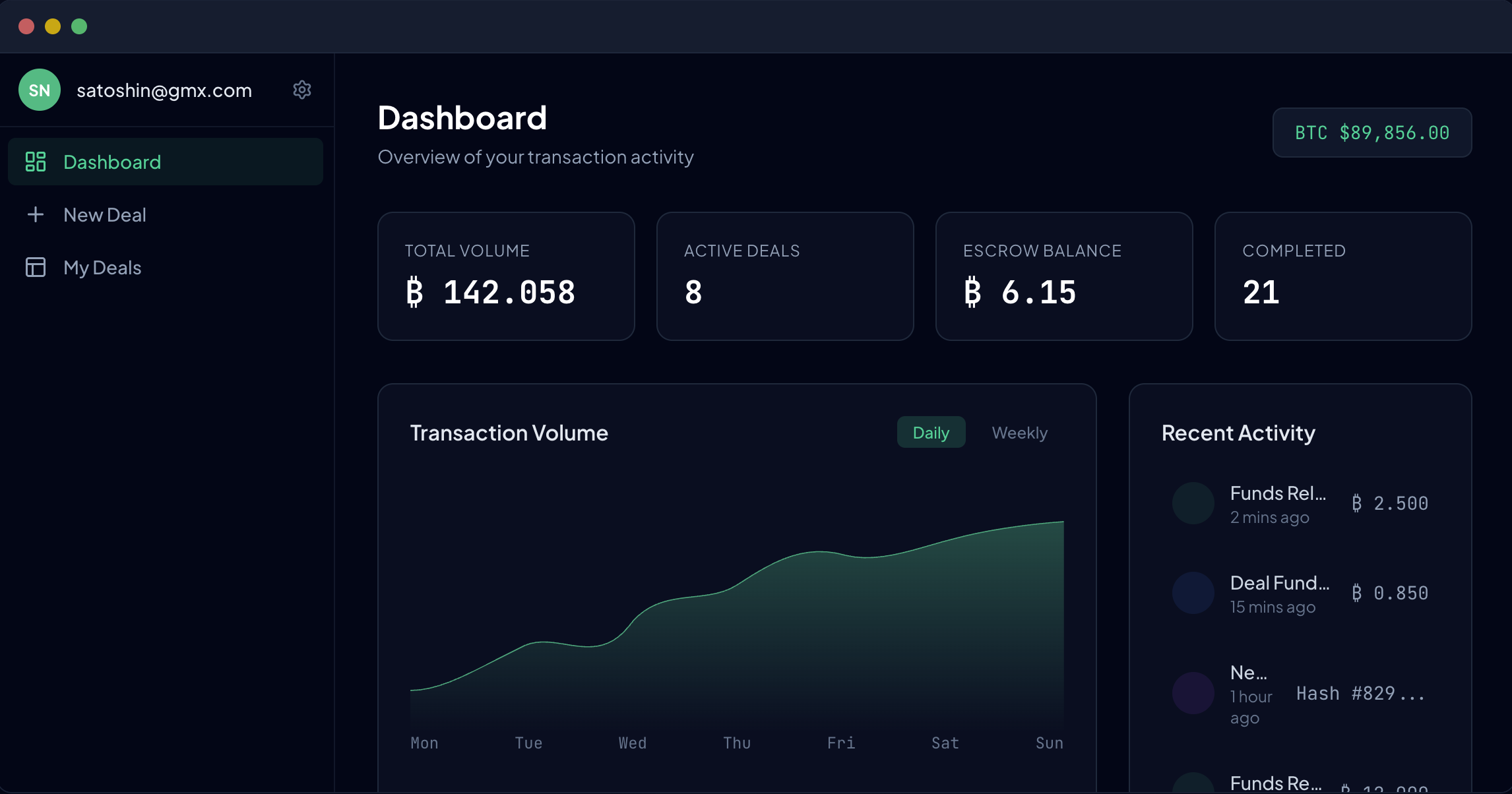 The platform itself handles coordination: deal creation, participant roles, transaction state, and communication. Bitcoin enforces the settlement.